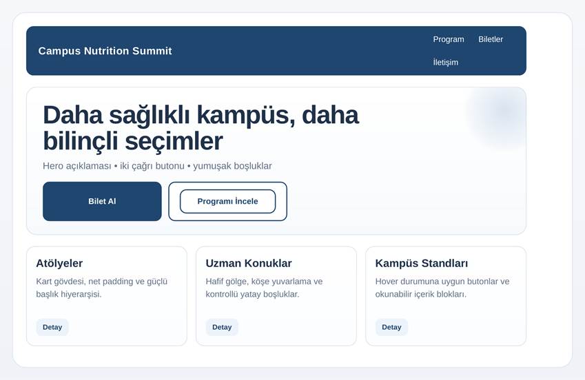 <article><h2>Kampüs Standları</h2><p>Kısa açıklama</p><a href=”#”>Detay</a></article>